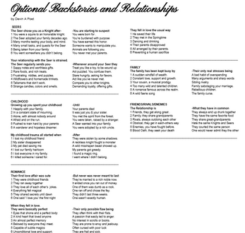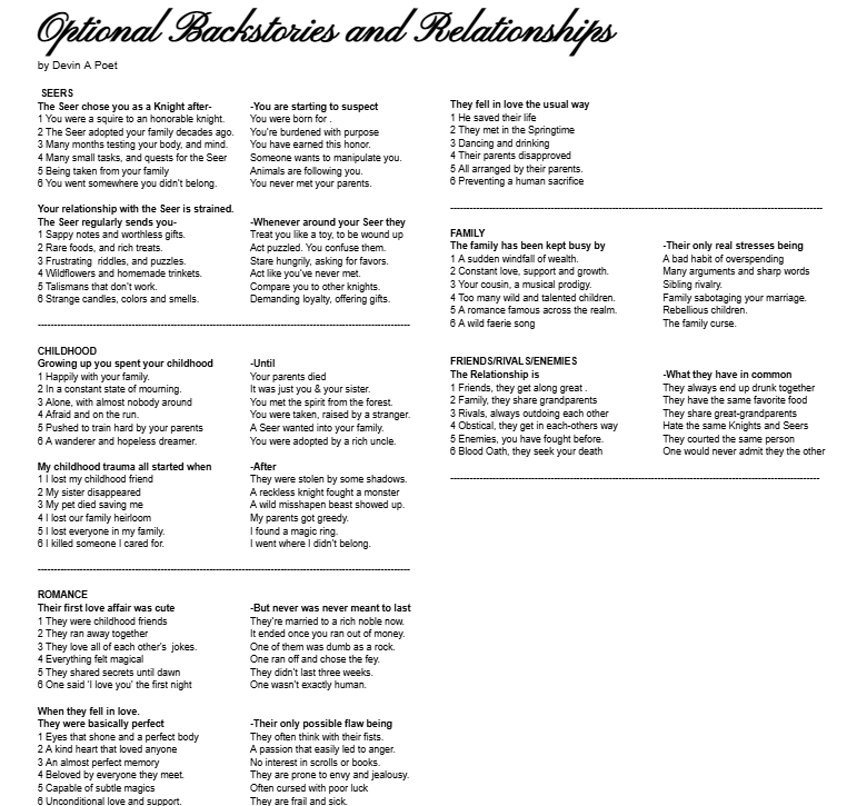 A number of random backgrounds for your Characters and NPCs, with a focus on Mythic Bastionland. With tables for character relationship with Seers, their Childhood, Family, and some Romantic Relationships.